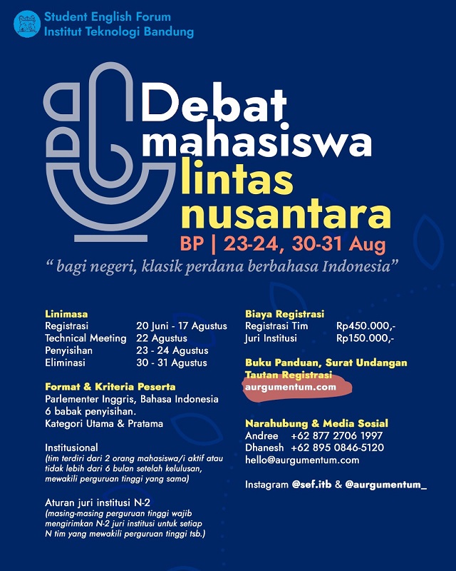 SEF Institut Teknologi Bandung bersama Aurgumentum dan komunitas debat Indonesia mempersembahkan dua ajang debat bergengsi: